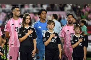 伊万卡的三个孩子是梅西、布斯克茨、诺沃本场的球童,伊万卡在社媒晒出照片写道:与梅西还有球队站在一起听着奏国歌,难忘之夜!迈阿密4-0,迈阿密魔力一路闪耀。
